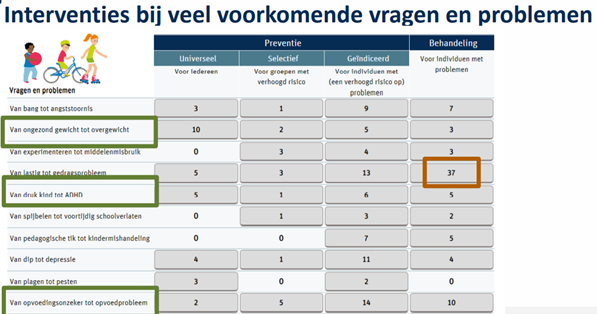 Inge legt uit dat als we samen afspreken dat we gaan doen wat werkt, het dan van belang is dat er een lijst komt met effectieve interventies. Er zijn verschillende bronnen waar je als professional terecht kunt voor informatie over wat werkt. Op de website van het NJi staan databanken van effectieve jeugdinterventies, richtlijnen en instrumenten. Zo kun je bijvoorbeeld op https://www.nji.nl/interventiesper thema een interventie zoeken. Op onderstaande afbeelding is de interventiematrix te zien van erkende interventies bij veel voorkomende vragen en problemen. Wat bijvoorbeeld opvalt is dat er veel interventies zijn op het gebied van gedragsproblemen, maar weinig op het gebied van middelengebruik. Inge en Bram benadrukken dan ook dat effectiviteit van jeugdhulpinterventies een jong kennisgebied is, en dat we van veel interventies gewoon nog niet weten of ze werken. Dat betekent ook dat veel interventies nog niet erkend zijn, maar dat wil niet zeggen dat de interventie niet werkt.