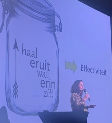 Inge trapt gelijk af door te vertellen dat ze vandaag de inhoud centraal willen stellen. De inhoud gaat volgens haar niet over geld en ook niet over politiek, maar over effectief werken: ‘Werken aan kwaliteit en effectiviteit is geen politieke keuze, maar iets wat je altijd met elkaar doet.’ En die stelling kan gelijk op instemming van het publiek rekenen.