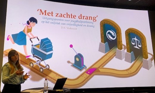 Denise Verkroost onderzocht dit juridische schemergebied waarin drang bestaat. Op 27 oktober 2022 is zij gepromoveerd met haar proefschrift ‘Met zachte drang’. Dinsdag 13 december heeft zij de deelnemers van de workshop ‘met zachte drang’ meegenomen in haar bevindingen. De workshop kenmerkte zich als verkennend, verklarend en als dialoog. Ten eerste werden wij meegenomen in het historisch perspectief van het juridisch kader binnen de jeugdhulpverlening. Hierbij werden verschillende (internationale) perspectieven benadrukt. In het tweede deel van de workshop werd verder ingegaan op de actuele situatie, conclusies en aanbevelingen vanuit haar proefschrift.
